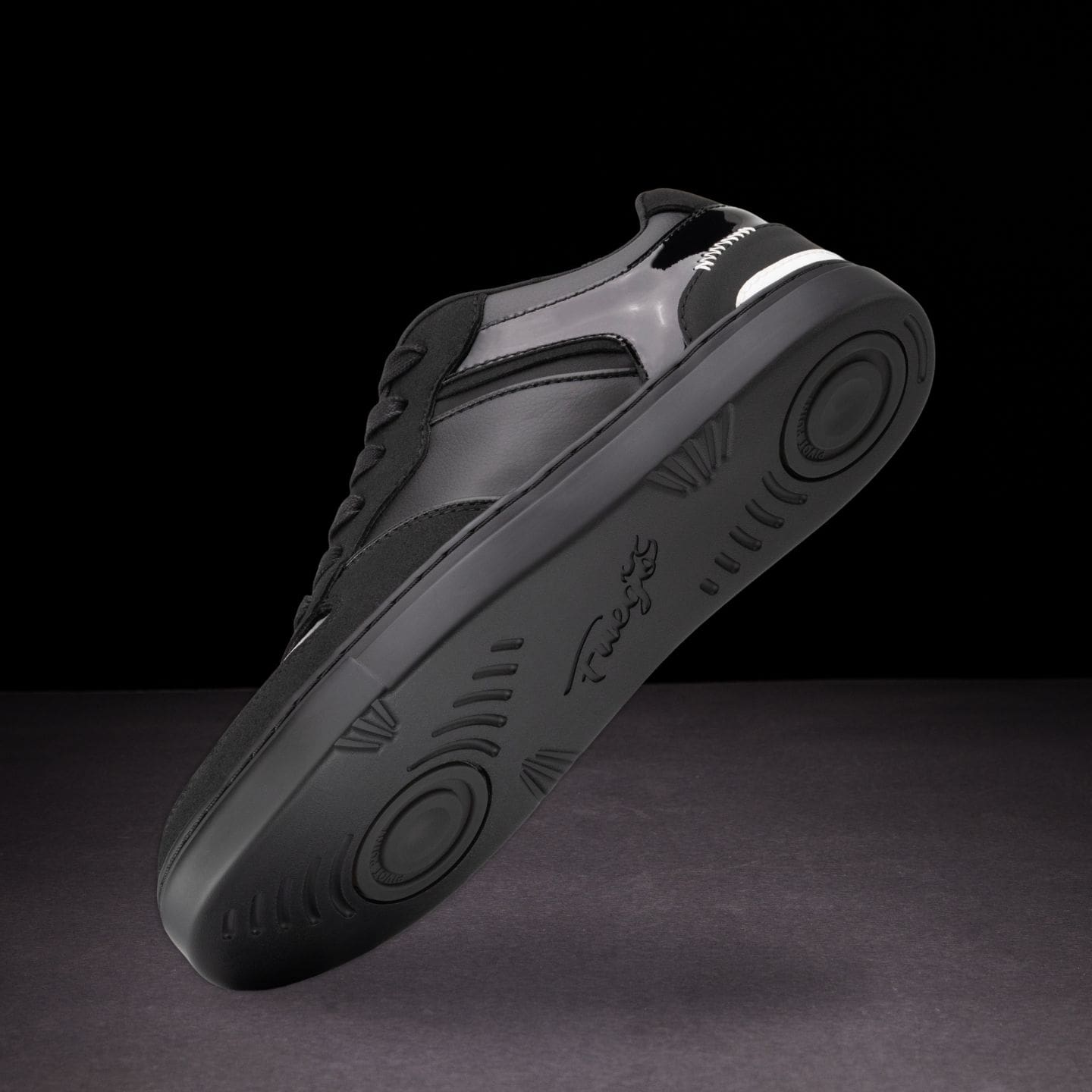 Elevated mix of vegan materials: patent leather, suede, nubuck, and tumbled leather